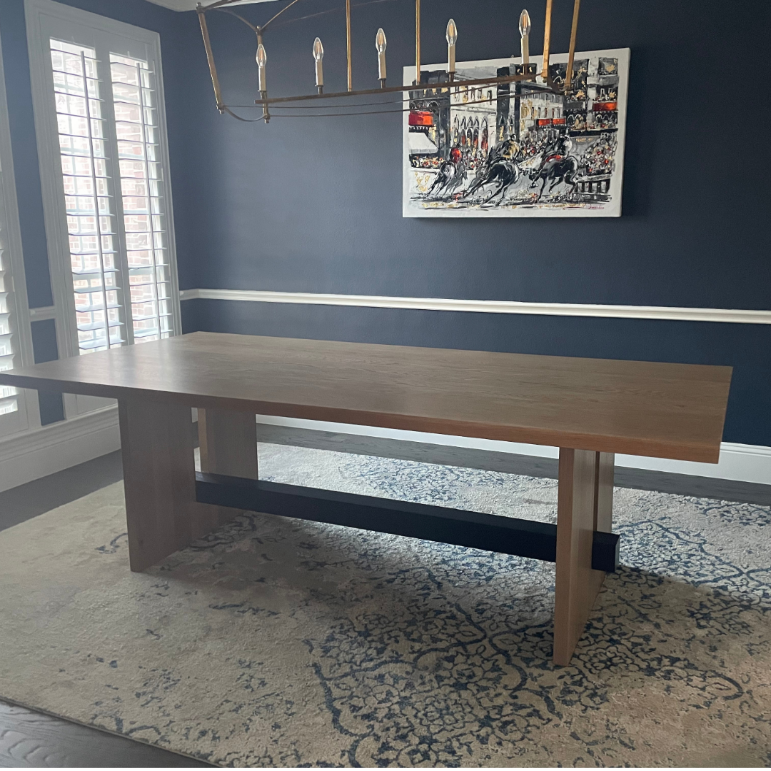 A custom built 8' dining room table from solid White Oak wood. The solid panel legs feature a custom cut out with black stained White Oak beam running across the bottom for support.