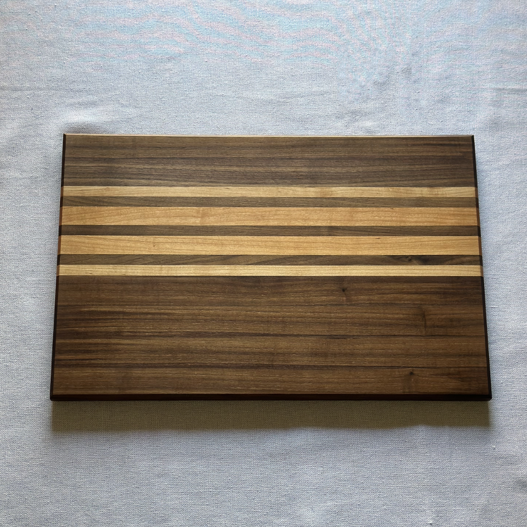 Our Everyday Board in solid Walnut wood with Cherry & Maple wood accents.